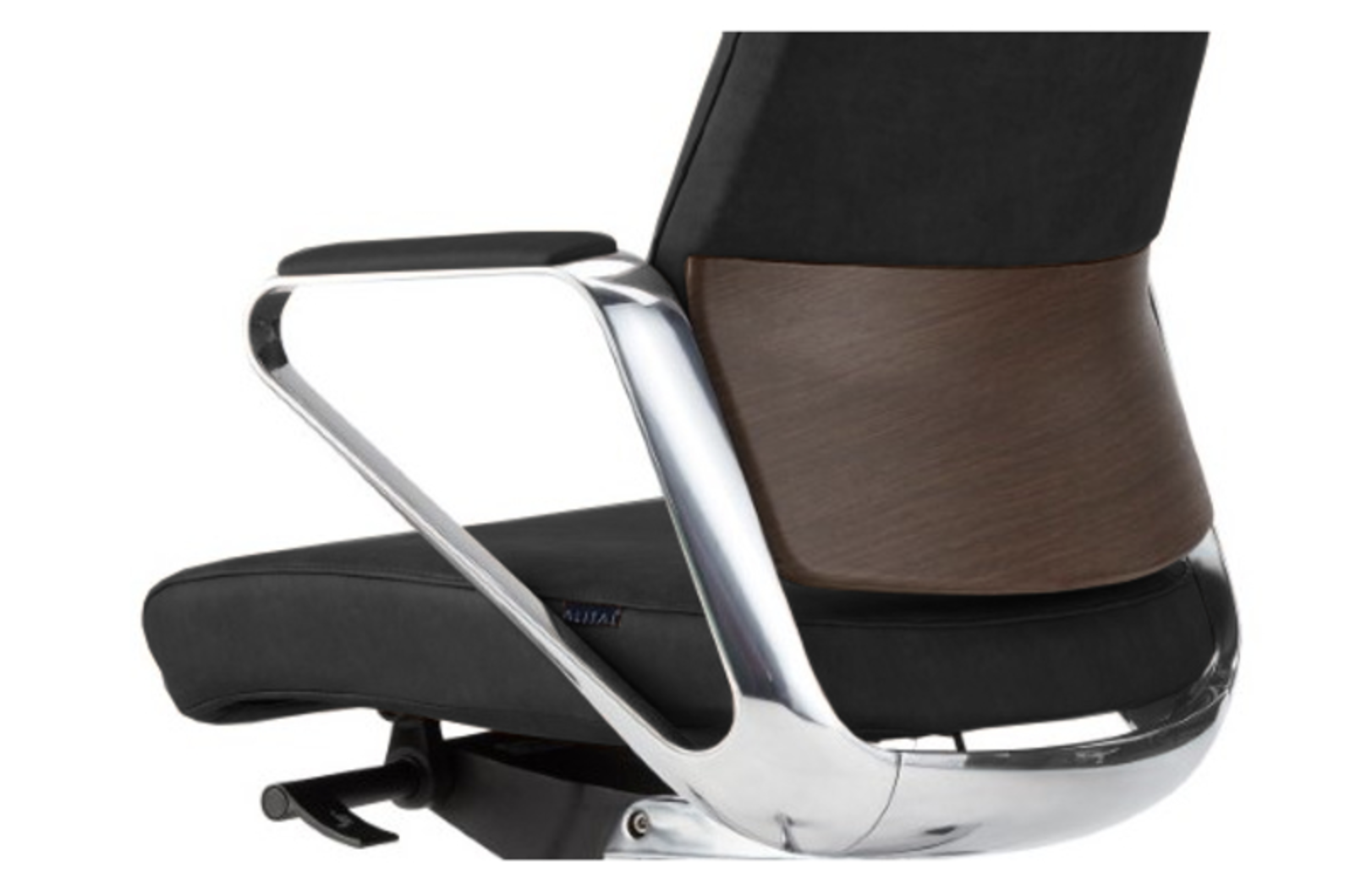 Cadeira Executiva A linha Helios Alital transmite de imediato a noção de sobriedade e solidez através do uso destacado de uma peça central em alumínio com acabamento polido e de dimensão significativa. Além do efeito estético cumpre também a função de apoio de braços e peça de união entre braços, costa e assento. O seu toque clássico da é reforçado através de um elegante painel a imitar madeira na parte traseira da costa.